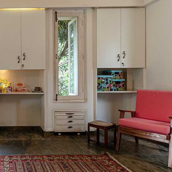 By retaining the base structure, demolition was minimised and embodied carbon preserved—adhering to resource optimisation. A muted palette and natural materials set a serene tone. Strategic windows and storage placement draw in daylight and frame surrounding greenery while shielding views from the street below. The space exemplifies functional efficiency in a compact footprint.