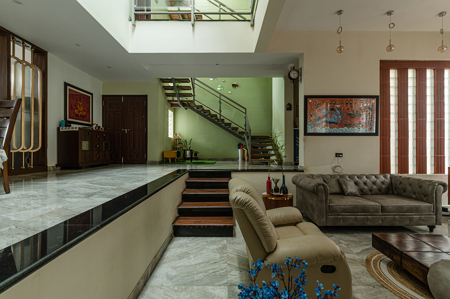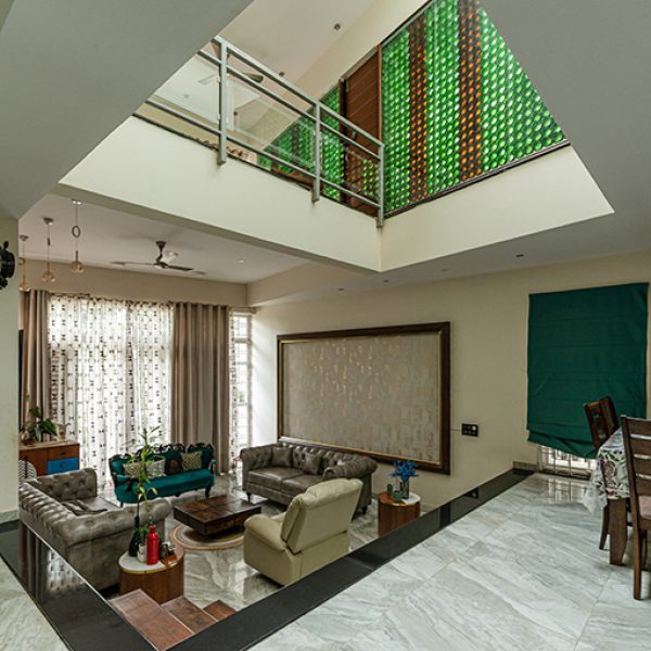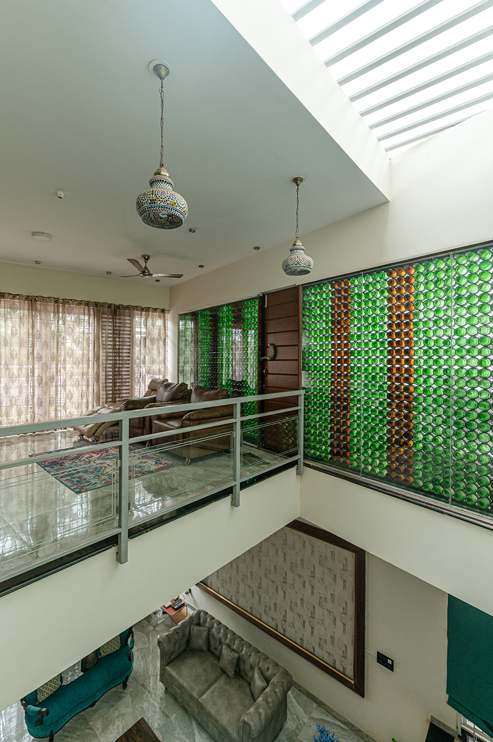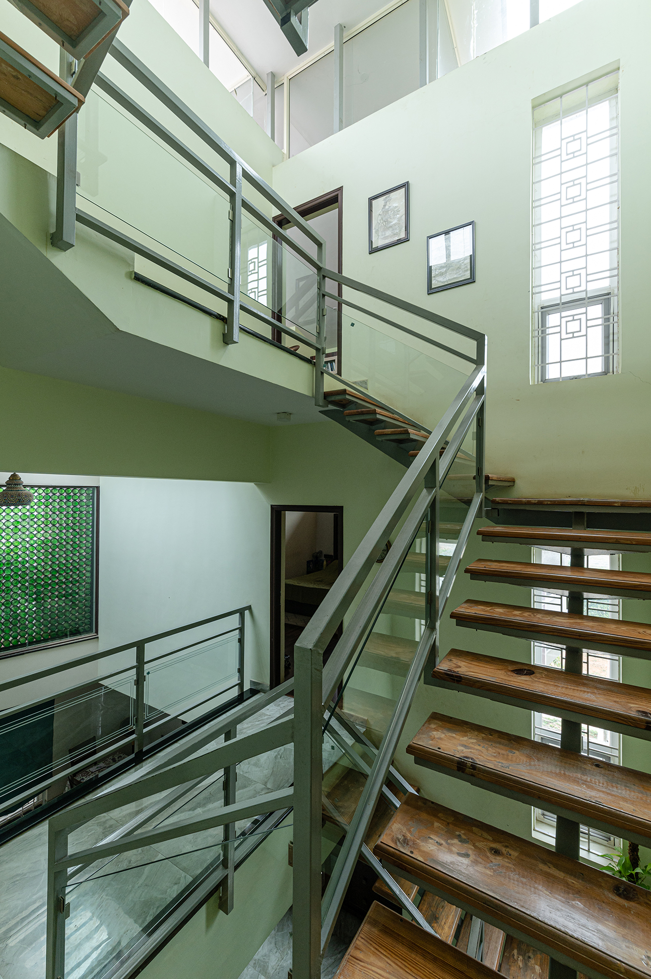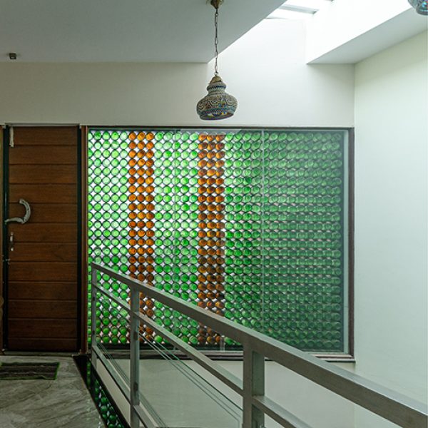 Passive cooling is embedded in the architecture: a stairwell stack effect and a playful beer-bottle wall on the west façade work together to keep the interiors naturally comfortable year-round. Within, open-plan arrangements and level shifts expand the experience of space, defying the compact 50x56 site