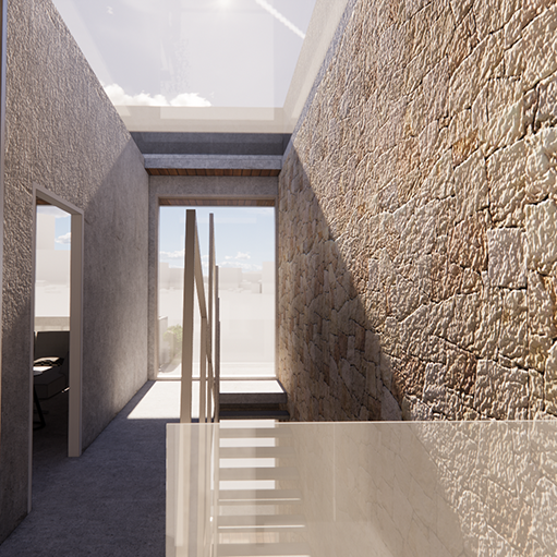 The west-facing overhangs serve a dual purpose: they reinforce the cascading terrace expression while shielding interiors from the harsh summer sun, yet welcoming low winter light deep into the home. Materiality strengthens the inside–outside connection. Stone cladding on the façade continues seamlessly into the interiors, softened by lush planting and the warmth of wood. At the core, a stone-clad staircase wall rises through the house, acting as a light well illuminated by a skylight above—creating a dramatic play of light and shadow throughout the day.