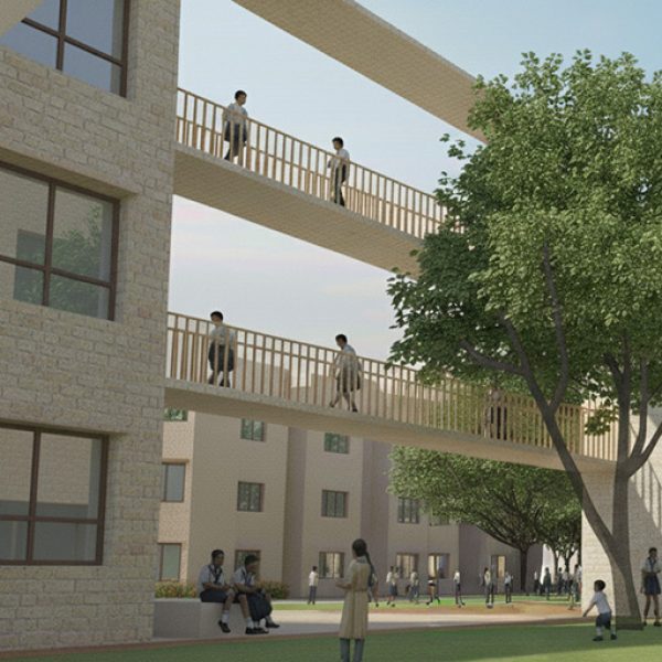 Corridors are envisioned as social spines—generous, shaded connectors that encourage informal interaction between students and faculty. These in-between zones extend learning into everyday movement, while buildings raised on stilts leave the ground plane open and flexible for outdoor classrooms, workshops, gatherings, and shaded play. Classrooms cluster around open courts, with buildings grouped like a small village linked by exterior corridors. Pathways sequence a progression of intimate courts culminating in a large, shaded sunken court at the campus heart. Here, a paved plaza—framed by tree groves—forms an informal amphitheatre and elevates the prominence of the library, the intellectual and symbolic centre of the campus.
